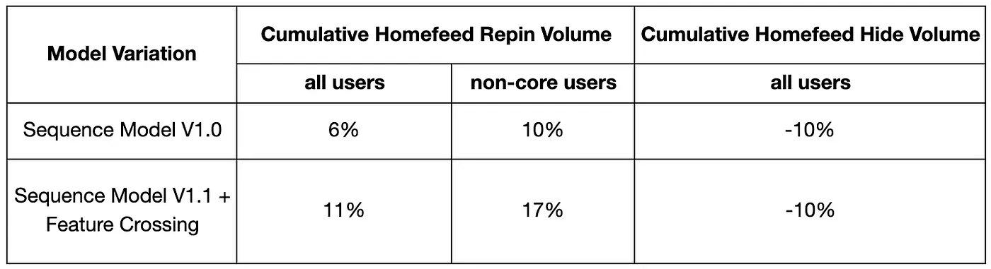 트래픽의 1.5%에 대해 A/B Test를 수행했을 때 Transformer v1.0이 적용된 그룹의 Repin Volume이 6%정도 상승했음