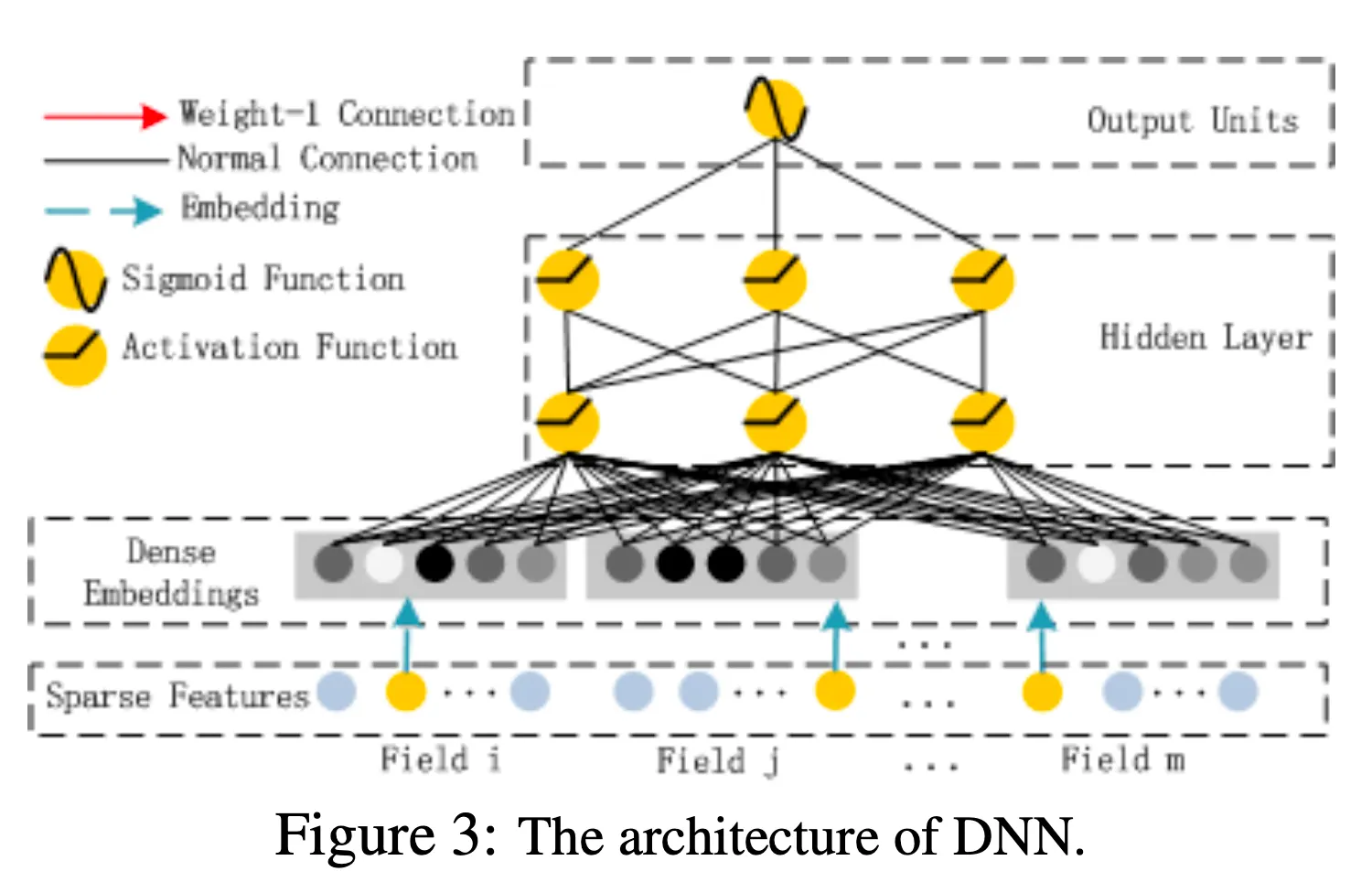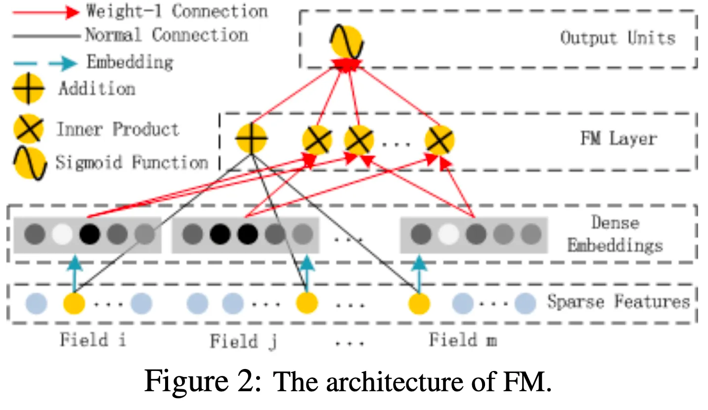 설명을 위해 Notation을 먼저 정의하고 간다. Dataset이 개의 인스턴스를 갖고 있으면 는 개의 Feature를 가지고 있으며, 는 클릭할 확률을 의미한다. 는 Categorical, Continous Feature 모두를 포함하며, 각각의 Instance는 차원의 와 의 집합으로 표현 가능하다. 일반적으로 는 고차원의, Sparse한 벡터이다.