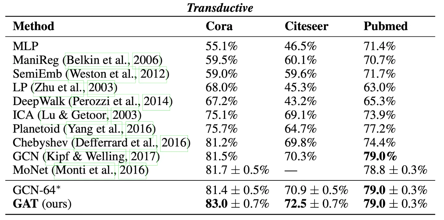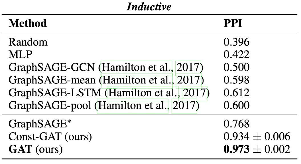 GAT를 GCN모듈로 사용해 당시 Transductive, Inductive BenchMark를 수행한 Figure이다. 당시 Transductive에서 많이 사용되던 GCN을 뛰어넘었고, 단백질 구조 예측 Task(Hard Inductive)에서는 GraphSAGE를 압도적으로 이기는 모습을 보여준다.