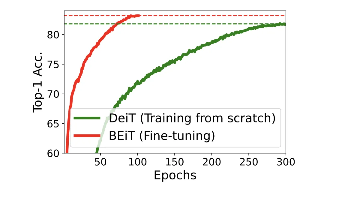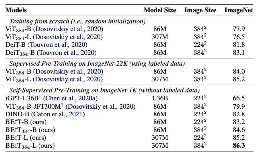 iGPT는 1.36B개의 파라미터를 썼음에도 BEiT가 압도해버린다.
