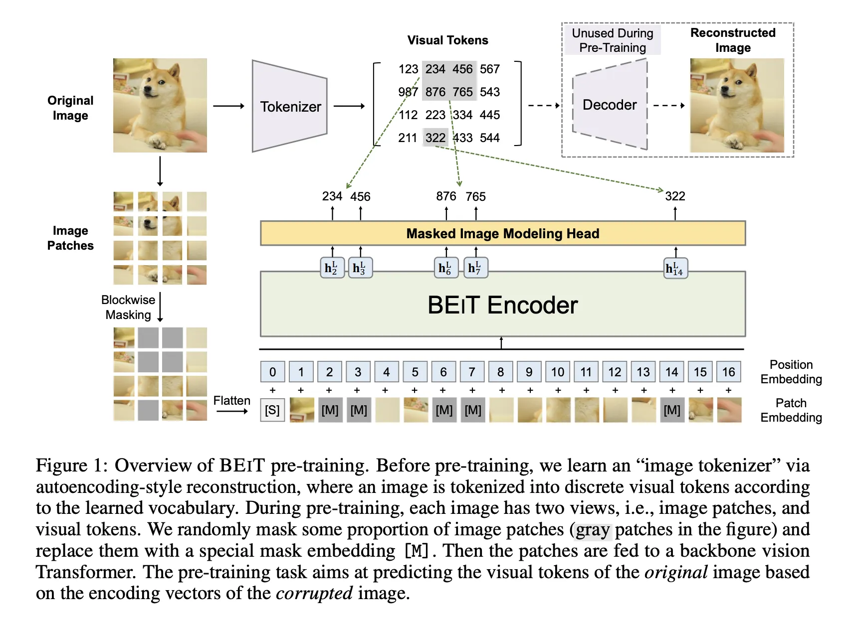 Image Patches의 일부(약 40%)를 랜덤하게 Mask하고 대응되는 Token idx를 복구하도록 학습시킨다.