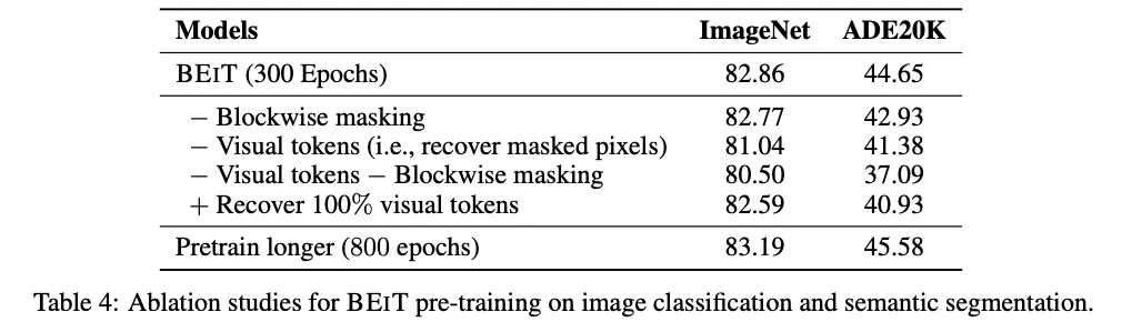 ViT-JFT300M은 훨씬 큰 Corpus(300M vs 1.3M)를 썼음에도 BEiT가 압도해버린다.
