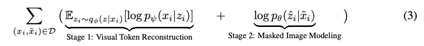 수식 (3) : Tokenize와 Decoder는 가져왔으므로 Stage2 Term이 BEiT의 Pre-Train Objective다.