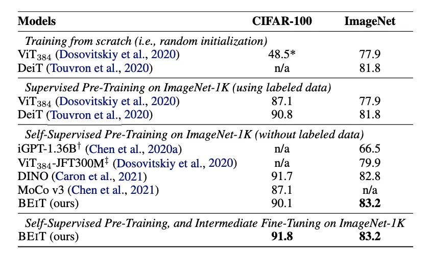 CIFAR : 작은 데이터셋에서 ViT는 제대로 작동하지 않는데, BEiT는 훌륭하다.