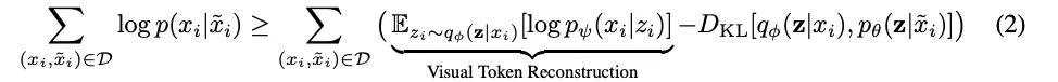 수식 (2) : [ : Image, : Masked Image, : Token] 으로 Notation한 ELBO의 수식이다.