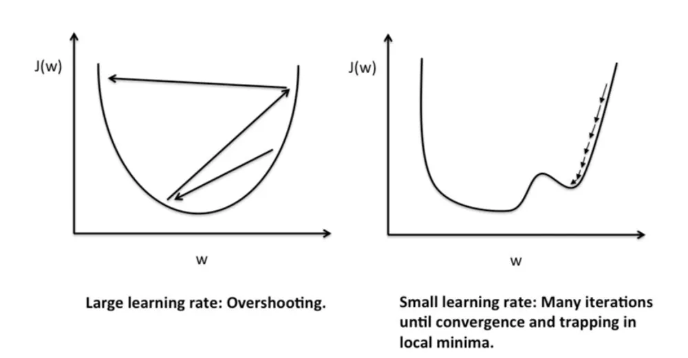 이때 중요한건 한 번 이동할때의 Step 크기다. 학습률(Learning Rate)로 표현되는 이 파라미터는 (1) 너무 크면 (예시가 직관적이지만) 바닥을 지나가 버리기 때문에 아예 내려가지 못할 수 있으며 (2) 너무 작으면 내려가는데 오래걸리고, 평탄한 지역을 바닥으로 착각해 진짜 바닥에 도착하지 못할 수 있다.