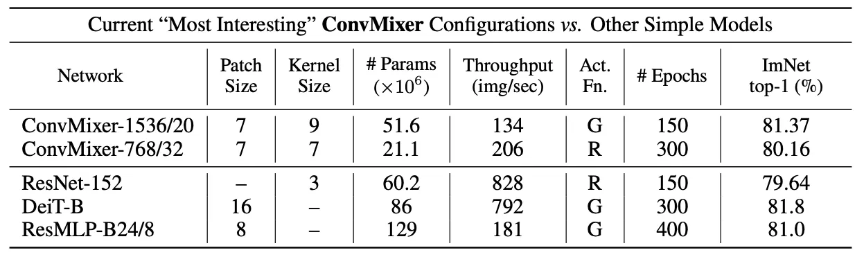 간단한 구조임에도 ResNets나 ViT, Mixer 시리즈 대비 동일 조건에서 우위 성능을 보인다.
