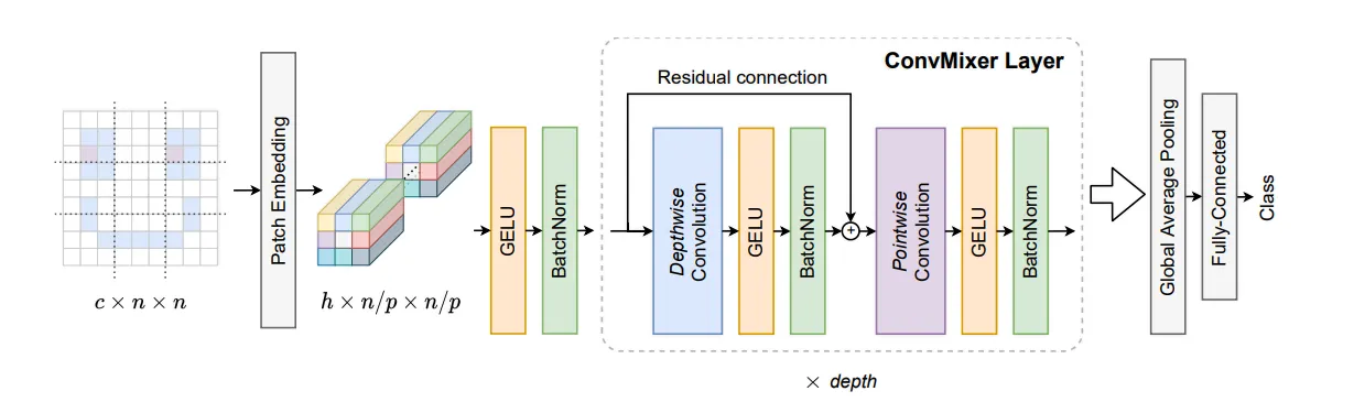 ConvMixer는 매우 단순한 모델로 MLP-Mixer와 유사한 구조를 가지고 있다.