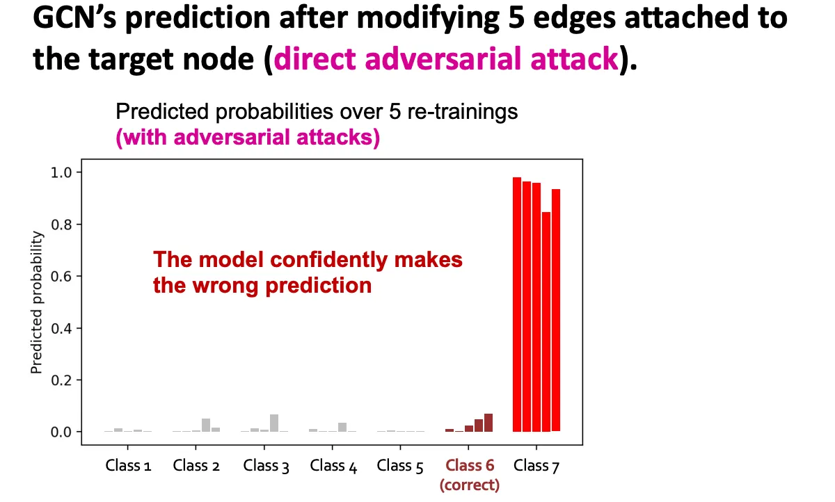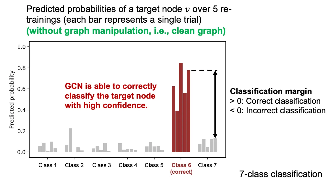 위의 세팅을 기반으로 7-class 분류를 GCN을 통해 5번 진행한 결과가 아래와 같다. 왼쪽 그림은 조작하지 않은 Graph의 결과인데, 5번 모두 Class 6으로 할당된 것을 볼 수 있으며, 다른 Class와의 Margin이 매우 큰 걸 볼 수 있다. 두번째 그림은 5개의 Edge를 Target Node에 붙인 결과인데 예측 양상이 크게 달라진걸 볼 수 있다.