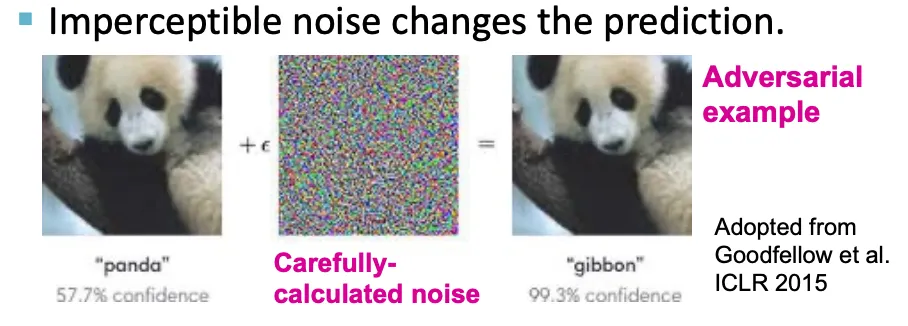 Adversarial Attack의 가장 대표적인 예시는 CNN와 Noise이다. NeuralNet을 교란시키기 위해 계산된 Noise를 원본 이미지에 더해주면, 육안으로 같은 이미지임에도 불구하고 전혀 다른 결과를 내뱉게 된다. CV Task 뿐만아니라 NLP와 Audio Domain에서도 Adversarial Attack이 가능하다.