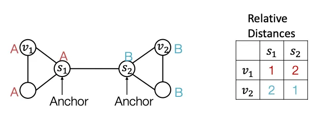 무작위로 Graph의 한 Node를 Anchor로 정했다고 가정해보자() Anchor(Reference Point)가 정해지면 거리를 잴 수 있고, 거리를 잴 수 있다면 위치 정보를 표현할 수 있다. 이때 Anchor Node 하나 당 Coordinate Axis 하나의 역할을 하므로 Anchor Node를 여러 개 사용할 수록 고차원적인 거리 정보를 표현할 수 있다.