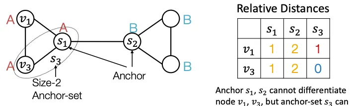 단순히 Anchor Node를 여러개 쓰는것 뿐만 아니라, Set 개념으로 접근하여, Anchor Set에 도달할 수 있는 최소거리 등의 정보를 이용할 수 도 있다. 아래는 , 을 하나의 Anchor Set으로 표현한 예시이다. 여러 사이즈의 Anchor Set을 사용하면 기존보다 효율적으로 Position정보를 인코딩 할 수 있다.