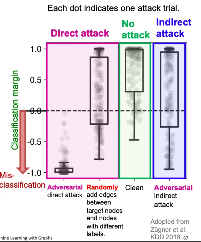GNN은 어떨까? 현실세계에서 GNN의 Application은 일반적으로 Public Platform이나, 금전적인 이익을 위해 사용된다.(Ex :RecSys, SNS, Search Engine)즉 현실적으로 GNN의 입력값을 조작하거나, 예측값을 해킹할 충분한 유인이 있다는 뜻이다. GNN은 Adversarial Examples에 대해 Robust할까?