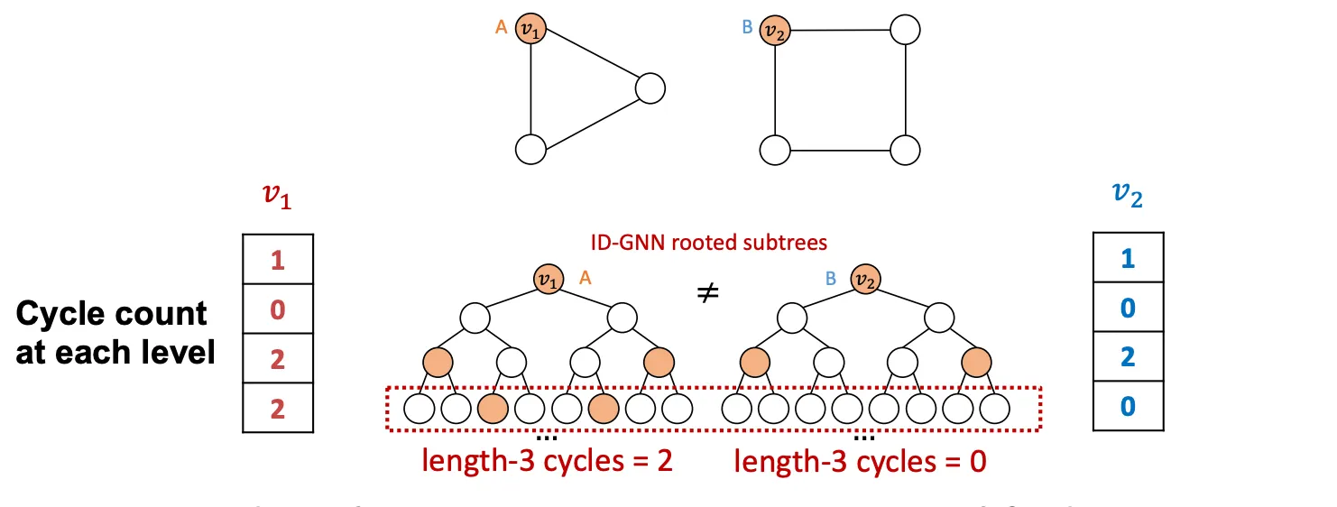 다시 풀어서 설명하면 Coloring된 Node는 다른 NeuralNet을 통해 Message Passing을 수행한다는 의미인데, 이렇게 다른 Computational Graph를 삽입하면 Coloring을 연산에 녹여낸 것과 같은 개념이므로. 기존에 GNN이 풀 수 없었던 Structure-Aware Task를 풀 수 있게 되는 것이다. 아래는 9강에서 부터 꾸준히 언급해왔던 문제인데, ID-GNN을 이용하면 쉽게 해결할 수 있는 것을 볼 수 있다.