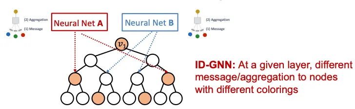 시작 Node에 구분할 수 있는 정보를 준다는, 너무나도 직관적인 방식으로 문제를 해결할 수 있음을 확인했다. 그러면 Coloring을 이용하는 GNN은 어떻게 만들 수 있을까? Heterogenous message passing을 이용해 Coloring 개념을 적용할 수 있는데, 이런식으로 Node를 구분하는 GNN을 ID(entity- Aware) GNN (이하 ID-GNN)이라고 부른다.
