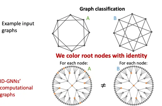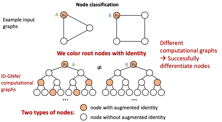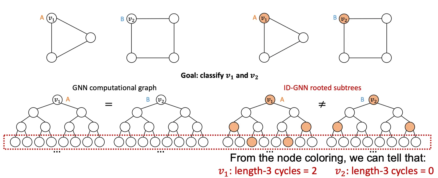 Node Level에서는 다른 입력인데 Compuational Graph가 같은 경우, Coloring을 이용하면 다른 Computational Graph를 갖게되어 Node Classification 문제를 쉽게 해결할 수 있다 !