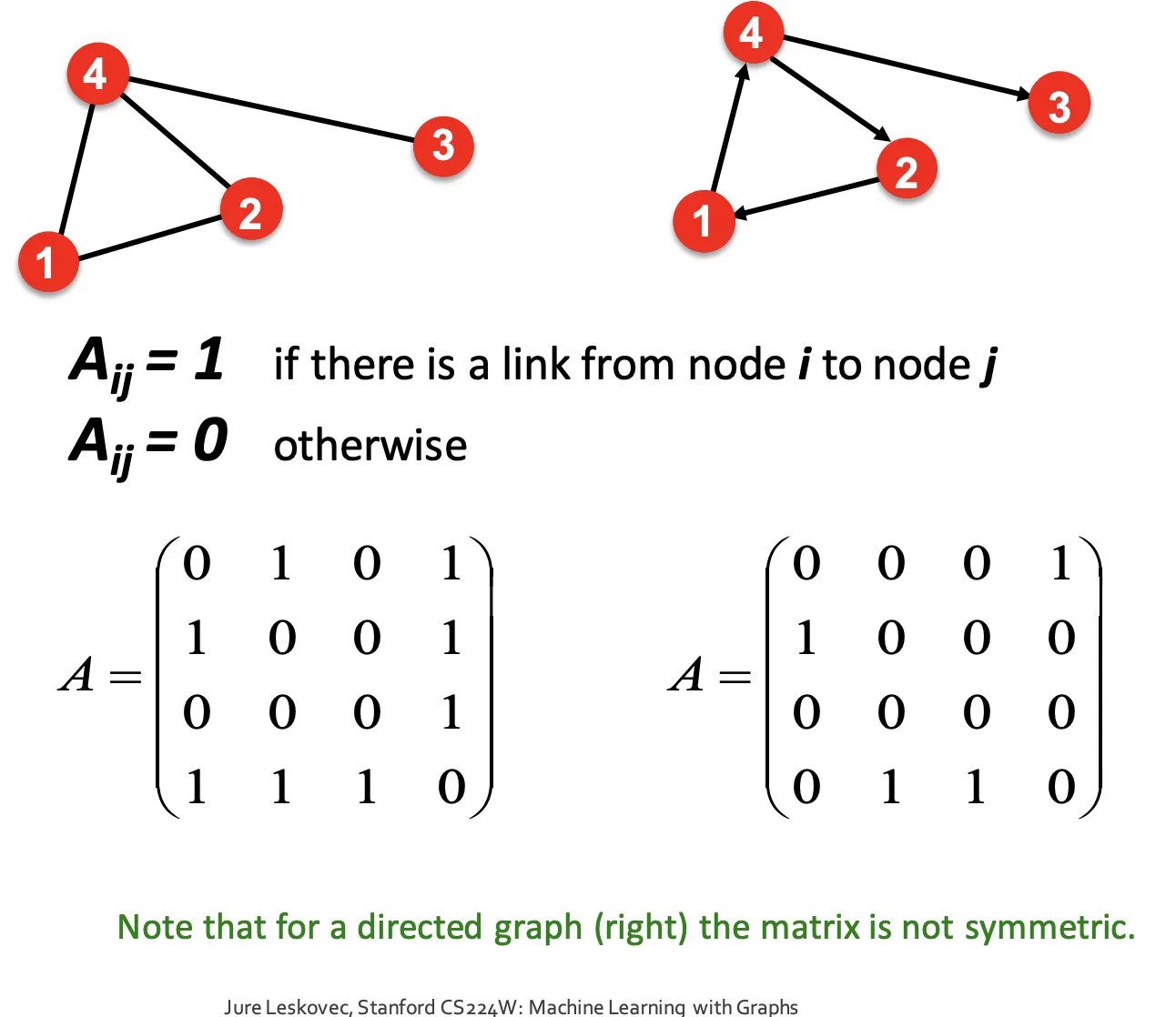 Node의 갯수가 일때, 행렬 를 만들고, 대응되는 위치의 노드가 연결 되어있으면 1, 아니면 0으로 표시한다. Undirected의 경우 Symmetric하다.