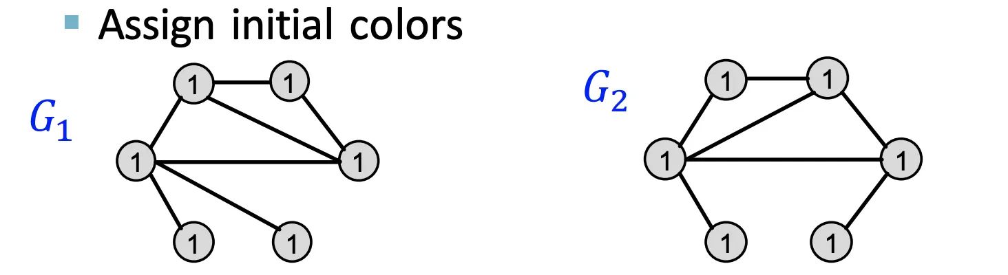 비슷하지만 조금 다른 Graph 두개 ()가 주어졌을때 Color Refienment 예시이다