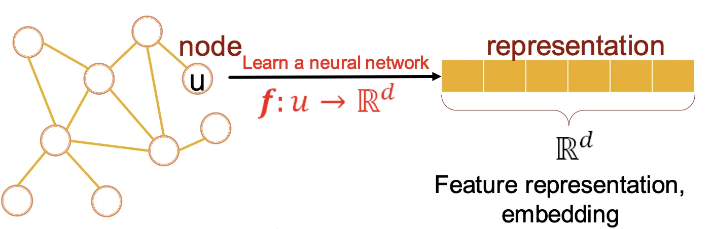 Feature Enginnering 과정을 없애기 위해 Graph의 Representation을 학습하는데, 이는 노드를 차원으로 임베딩 함으로서 이루어진다. 임베딩이 잘 되면 DownStream Task에 쉽게 적용이 가능하므로 결국 우리의 목표는 Graph(Node, Grpah, Link등)을 차원으로 잘 임베딩 하는 것이다.