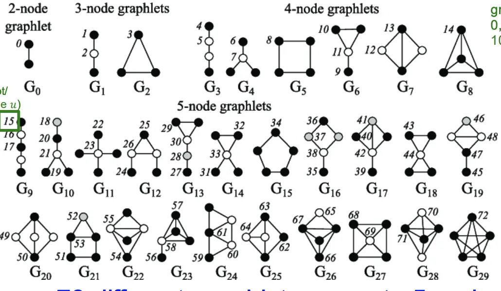 2~5개의 Node가 참여하는 Graphlet의 갯수는 73개이다. 이를 73차원의 벡터로 표시할 수 있고, 각 Index는 특정한 Neighborhood Topology에 Signature이다. 이 벡터를 이용해 Node의 Local Network Topology를 잘 정제된 Feature로 만든게 GDV이며, 앞에서 소개한 방식보다 자세한 정보를 갖고있다.