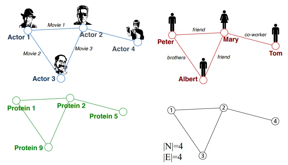 Graph는 훨씬 복잡한 구조를 가지고 있어 모델링이 어려운데, 예를 들면 다음과 같다.