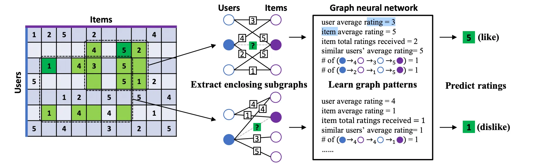 IGMC는 Rating Matrix를 이용해 Bipartite Graph를 만들고 Interaction을 Edge, Rating(점수)를 Edge의 Class로 사용한다. 즉 Matrix Completion를 Labeled Link Prediction 문제로 풀겠다는 의미이다. 이런 시도는 전에도 있었지만 IGMC가 Novelty를 갖는 부분은 Node Pair()의 Subgraph를 뽑아서 학습시킨다는 점이다. 이렇게 뽑힌 Subgraph는 GNN에 입력되어 구조적인 정보만으로 Link Class즉, Rating을 예측하도록 학습된다. 이 방법 덕분에 Side Information에 의존하지도 않고, Rating Matrix를 통째로 연산할 필요도 없는 효율적인 모델을 만들 수 있다.
