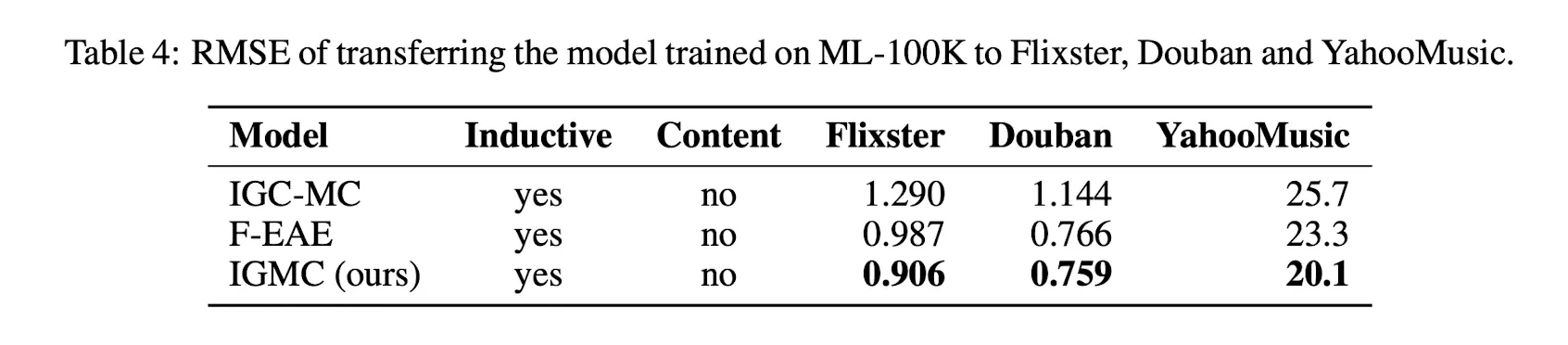 Matrix Completion Task에 사용되는 Dataset 5개(Flixster, Douban, YahooMusic, ML-100K, ML-1M)에 대해 실험을 수행했다. IGMC는 pytorch_geometric 을 이용해 구현했으며, 사용한 모델은 4-Layer