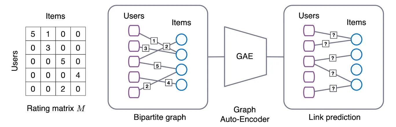 GCMC는 Bipartite Interaction Graph에 대해 미분 가능한 Message Passing을 수행하는 AutoEndoer 기반의 모델이다. 일반적인 Collaborative Filtering BenchMark를 상회하는 성능을 보이며, Social Network같이 구조적인 정보나 Feature가 풍부한 세팅 아래에선 SOTA를 상회하는 성능을 보인다.