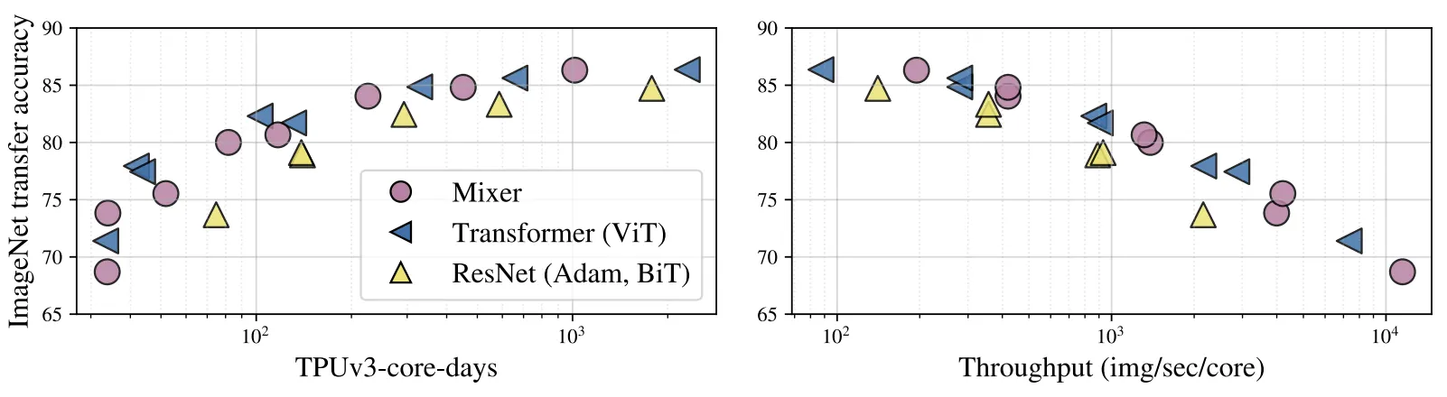 Scale이 작을땐 Mixer가 상대적으로 낮은 성능을 보이지만, Scale이 커짐에따라 SOTA급 성능에 가까워진다.