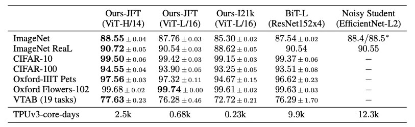 모든 Task에서 ViT가 BiT(같은 Dataset으로 Pre-Train)보다 우위, Cost도 적게 듦
