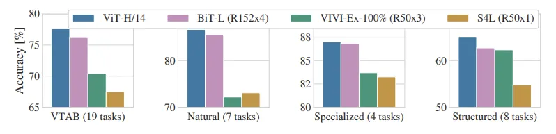 ViT가 Specialized에선 SOTA와 유사한 성능, 다른 Task에선 우위의 성능을 보임